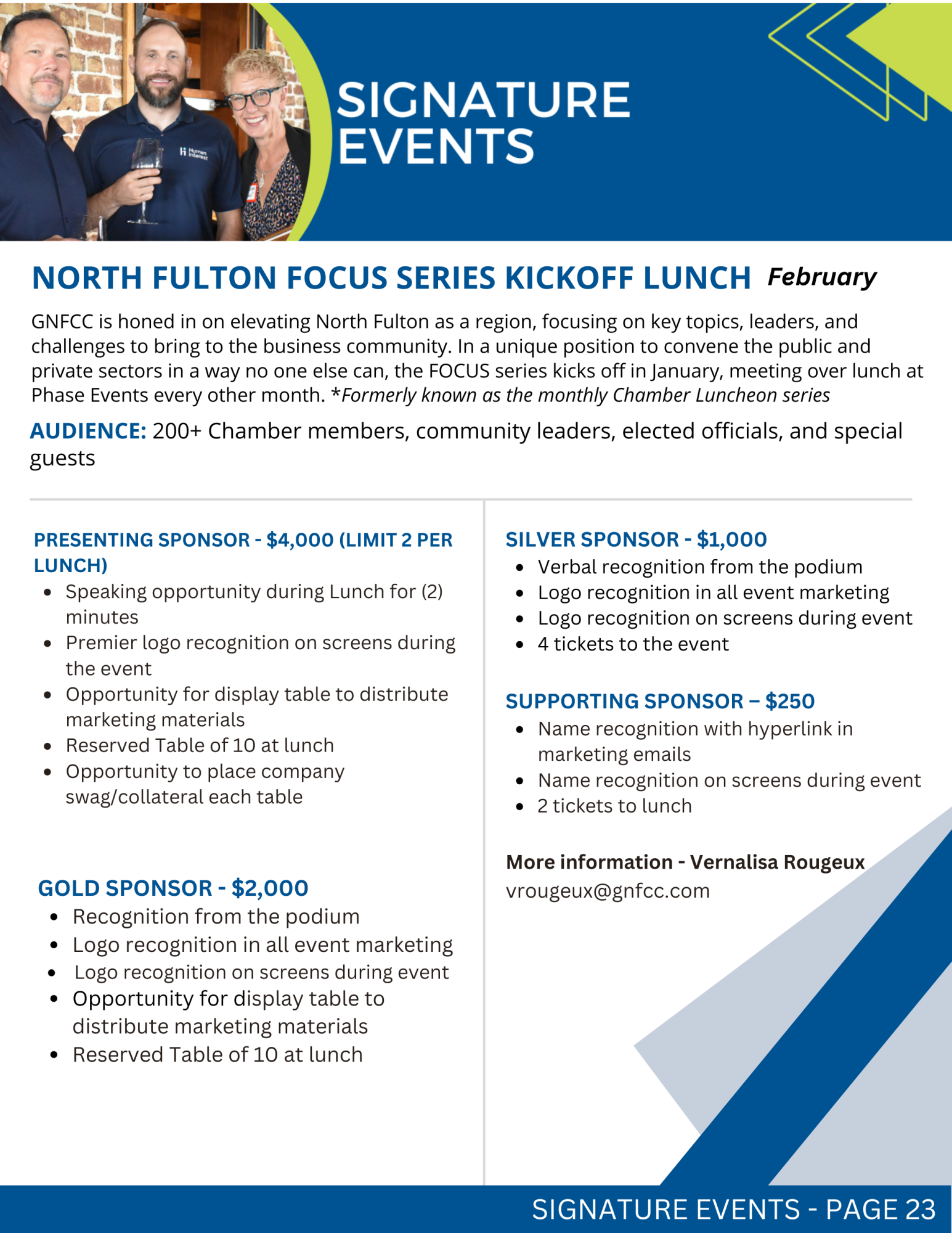 GNFCC is honed in on elevating North Fulton as a region, focusing on key topics, leaders, and challenges to bring to the business community. In a unique position to convene the public and private sectors in a way no one else can, the FOCUS series kicks off in February, meeting over lunch at Phase Events in Alpharetta.
