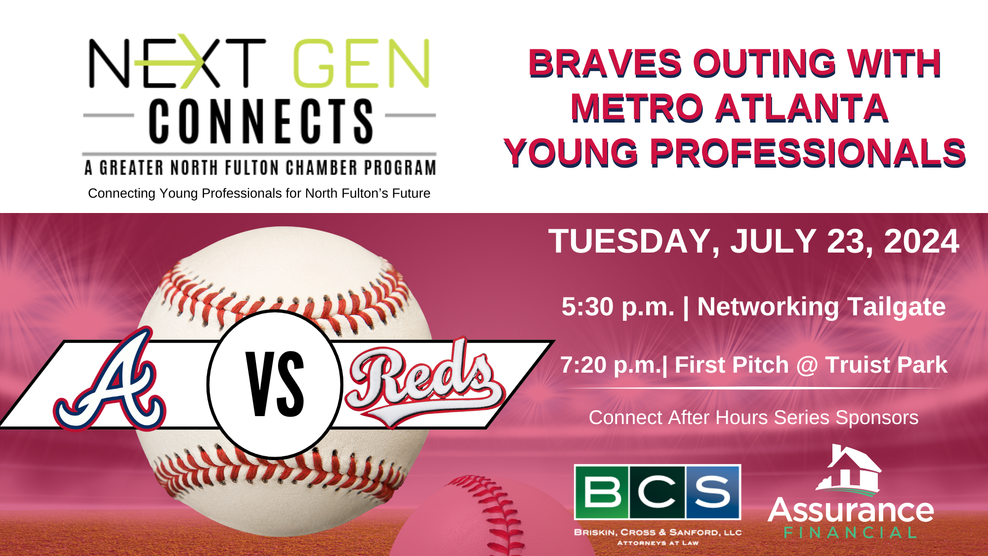 Join young professionals from the Greater North Fulton Chamber, Cobb Chamber, and Brookhaven Chamber as we enjoy drinks and networking followed by watching the Braves take on the Cincinnati Reds at Truist Park.
